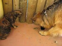 Mango’s reaction probably wasn’t what Sid was hoping for, as 40kgs of German Shepherd leapt into the air, and backed off, staring at the shivering little bundle of fur. All three animals sat completely motionless, staring at one another. Sid looked quizzically at Mango wondering why she hadn’t pounced on to her little meal …